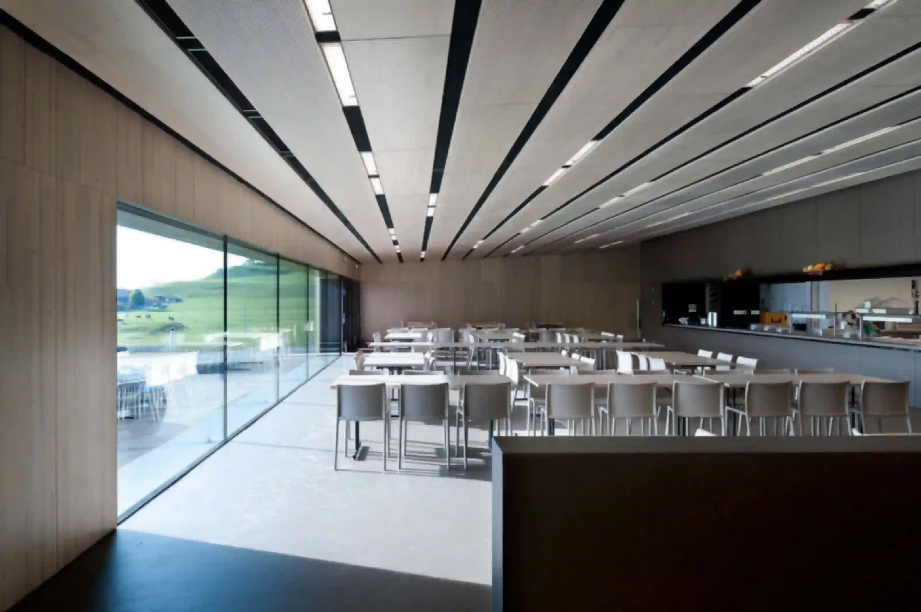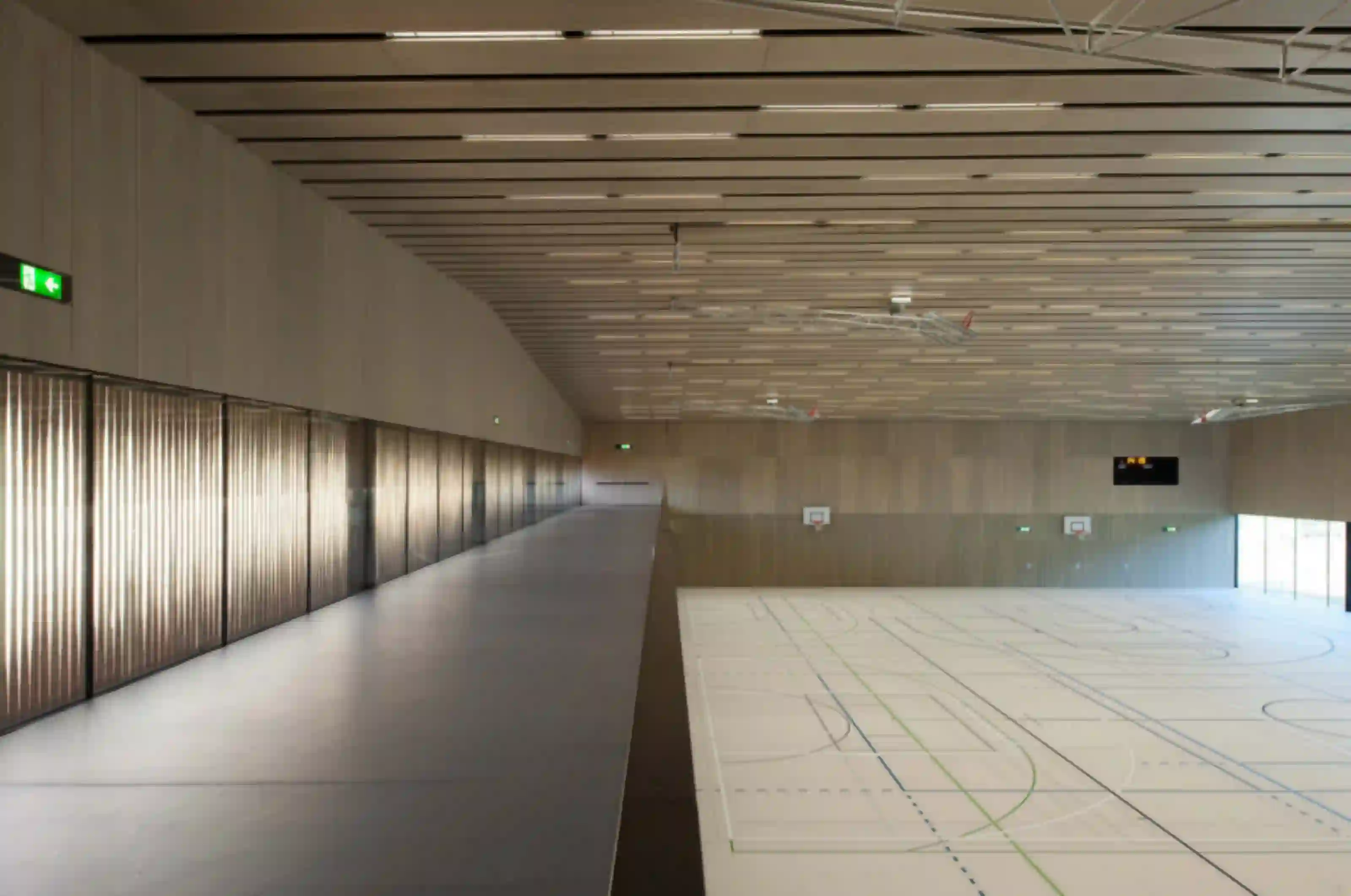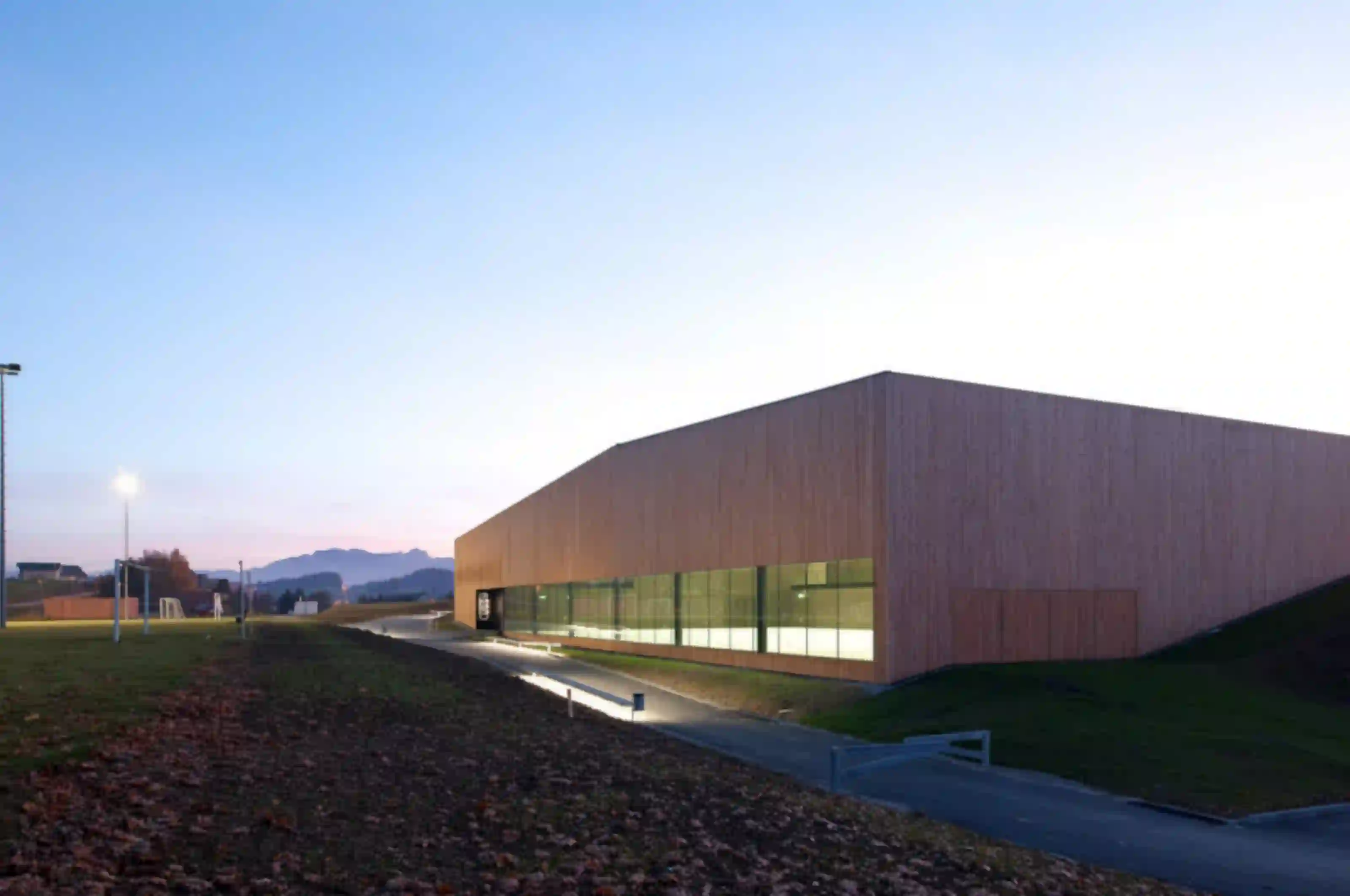 C’est dans un environnement paysager vallonné, au pied des Préalpes, que vient s’implanter sur une butte existante la nouvelle salle de sport triple de Châtel-St-Denis. Entre champs et prairies se confond dans le paysage la construction caractérisée par deux longs pans de toiture faiblement inclinés. La salle est réalisée essentiellement en charpente bois, qu’il s’agisse de la structure de la toiture, des façades ou du bardage extérieur. Le traitement des façades, leur matérialisation et l’exécution des détails confèrent au nouveau bâtiment un caractère unique.