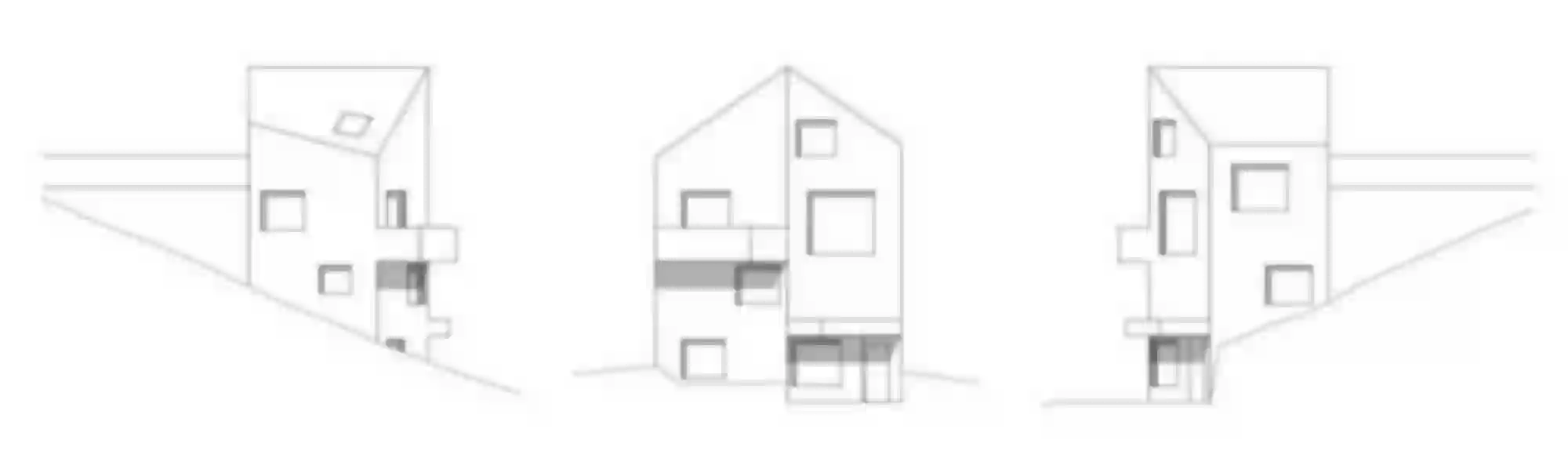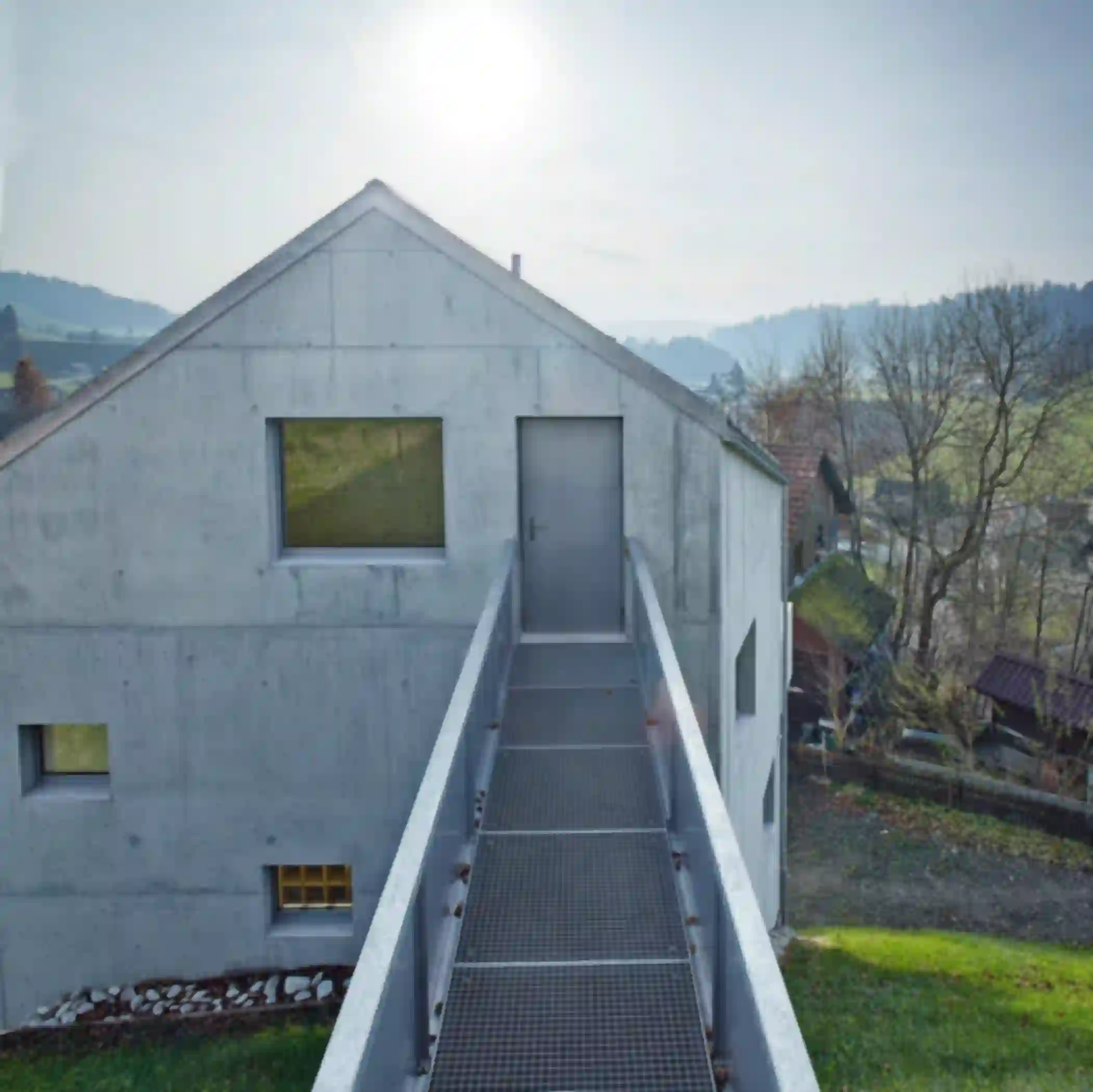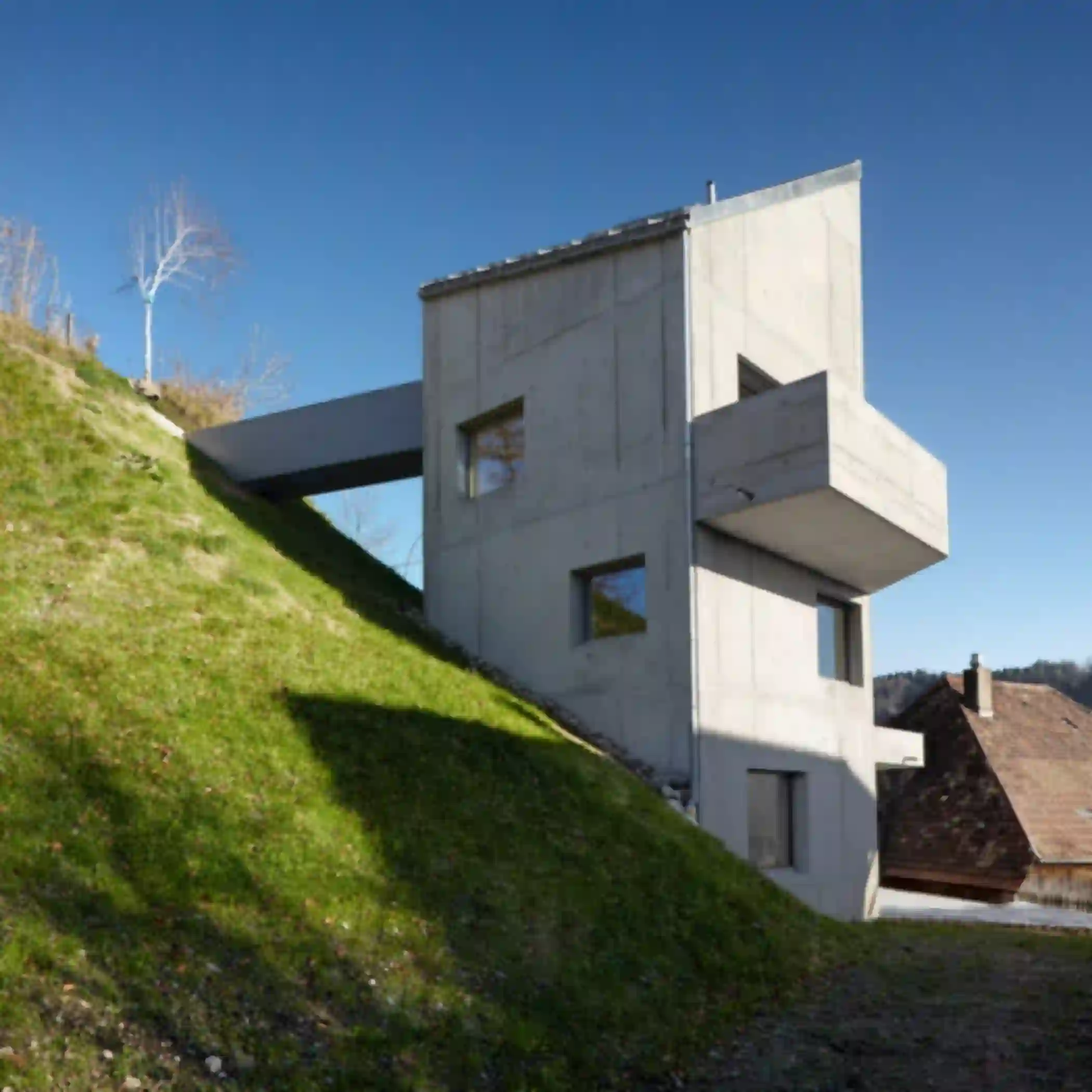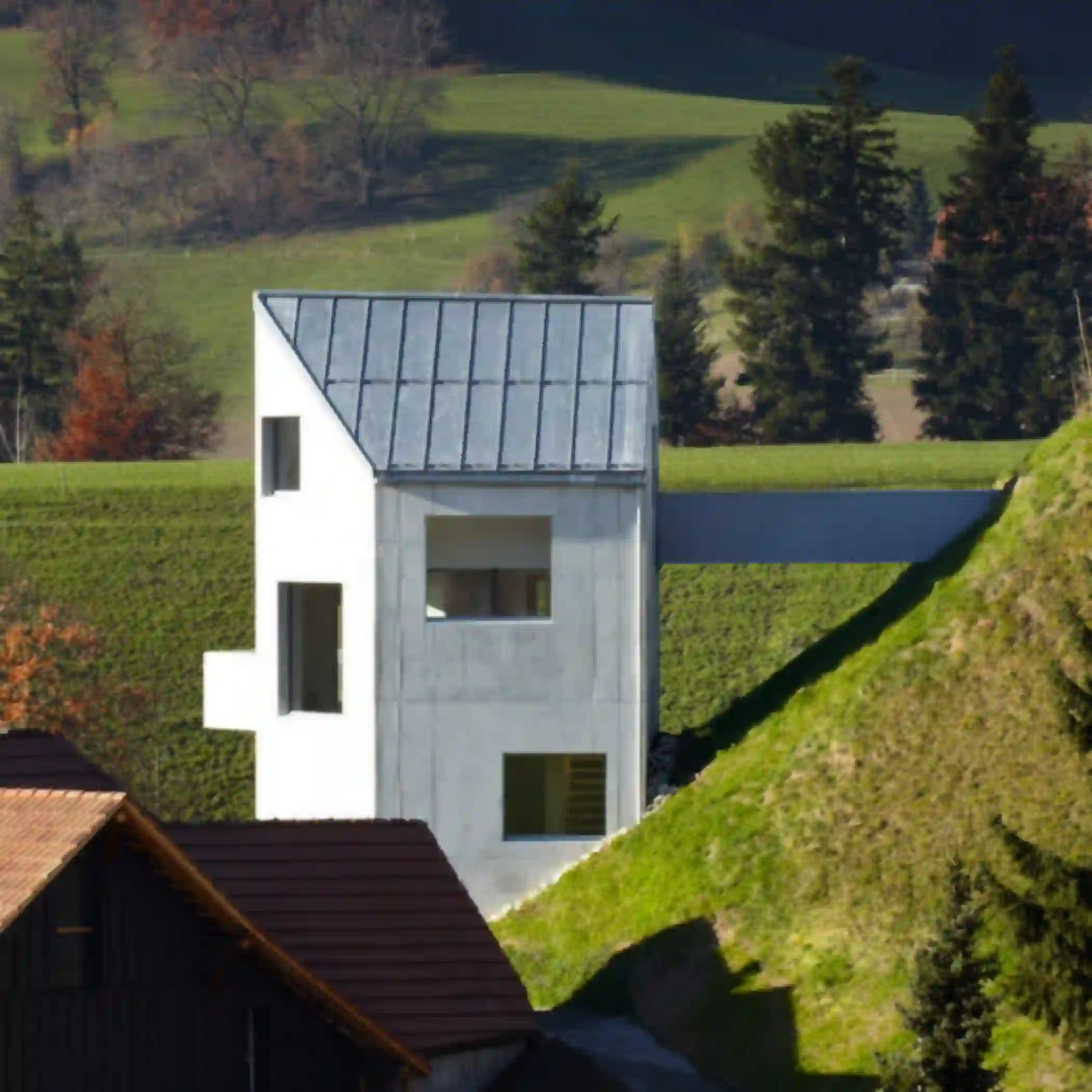 Une lecture habile du règlement de construction a permis, sur un terrain d’à peine 70m2, la réalisation d’une maison d’habitation, telle une tour qui jaillit de la colline. Une bibliothèque en bois, imbriquée dans un escalier droit, relie les 4 niveaux d'habitation. La promenade à travers les différents étages offre des vues et perspectives variées sur les alentours. Le bâtiment conçu en béton apparent s’inscrit comme une sculpture dans le paysage environnant et reprend, via son toit en pente, le langage architectural des constructions voisines.