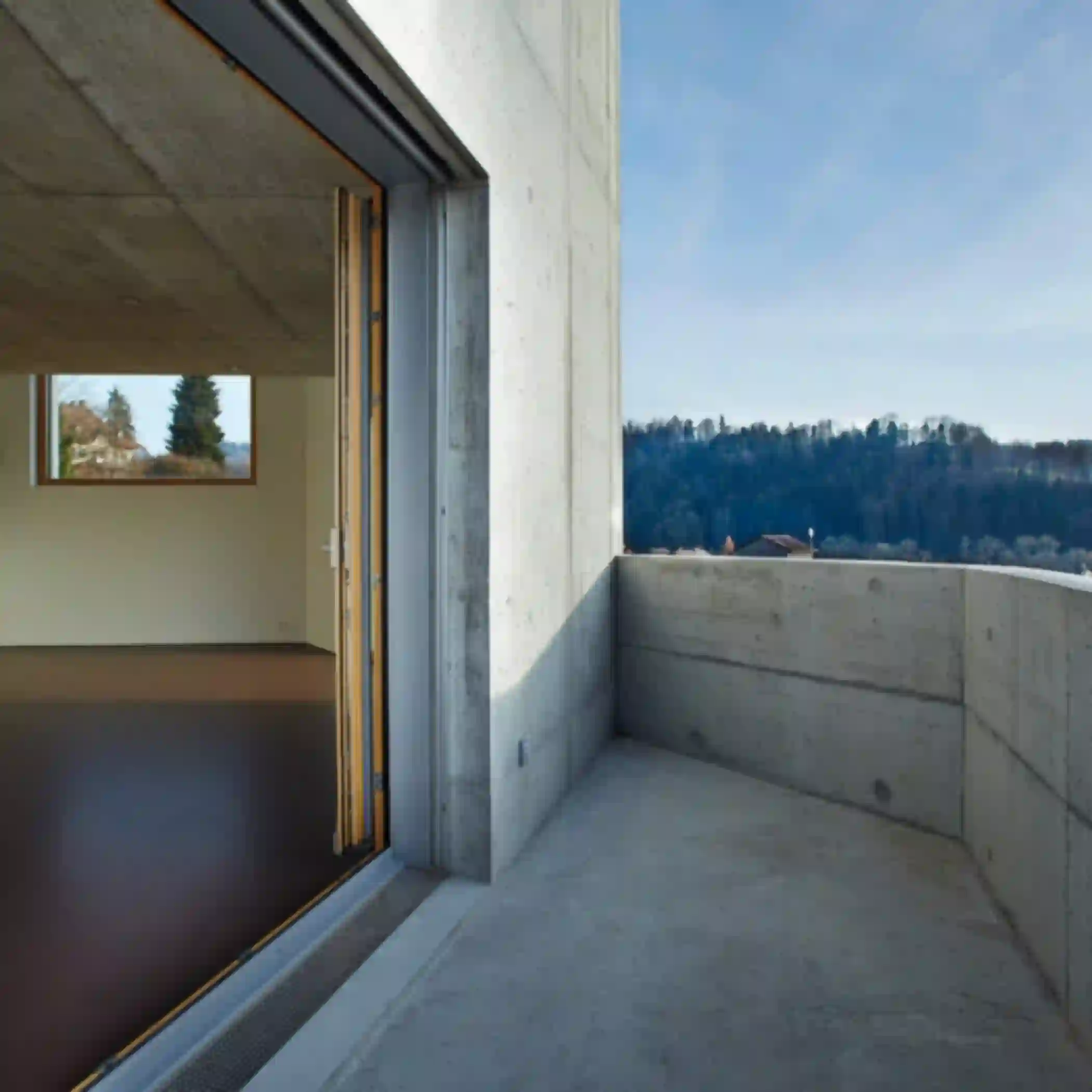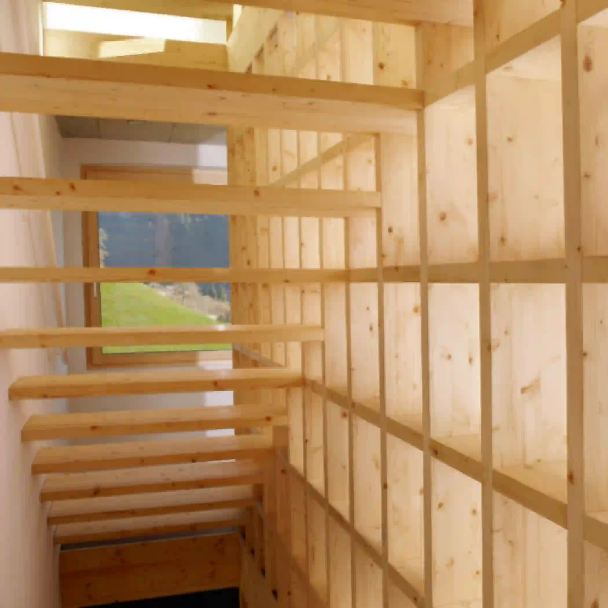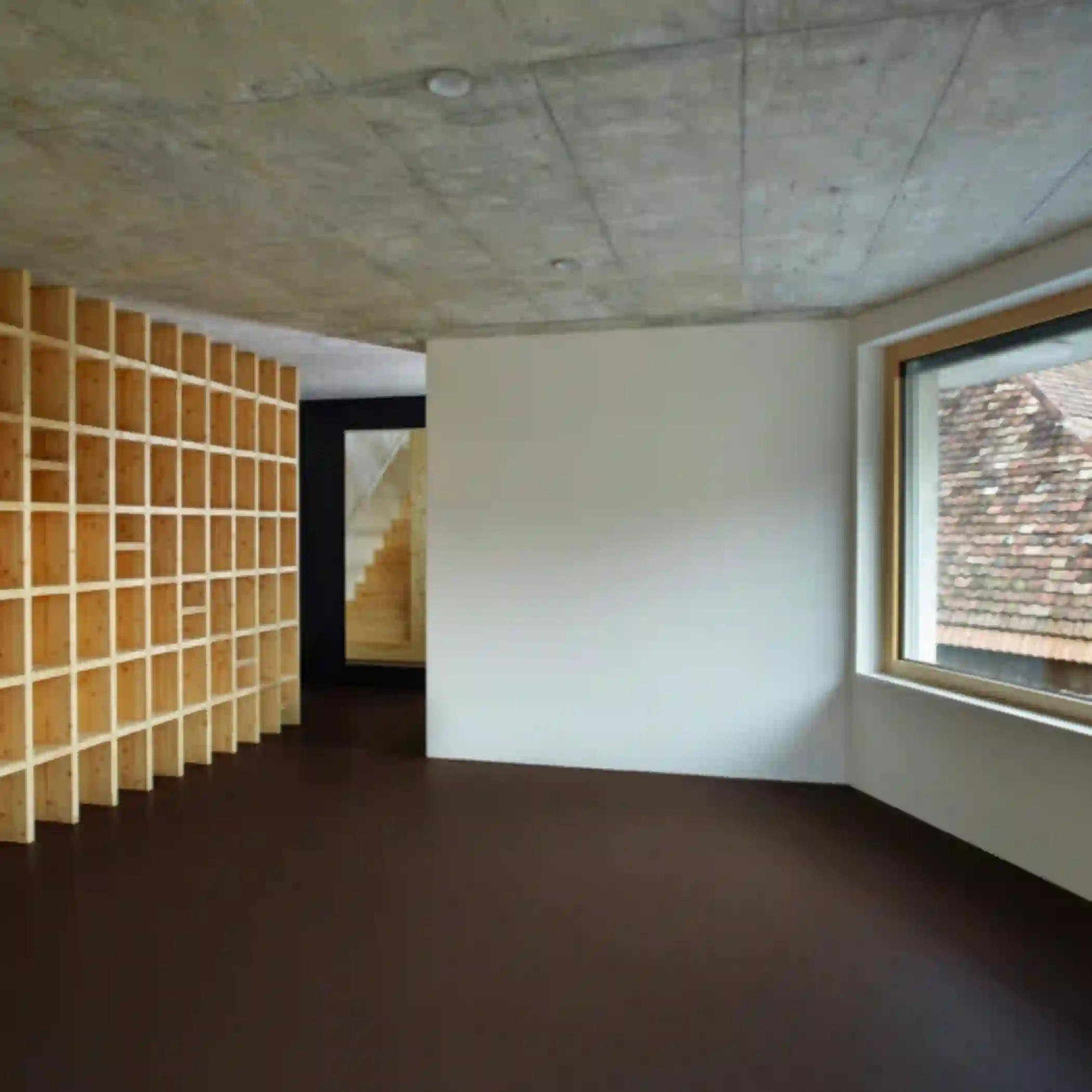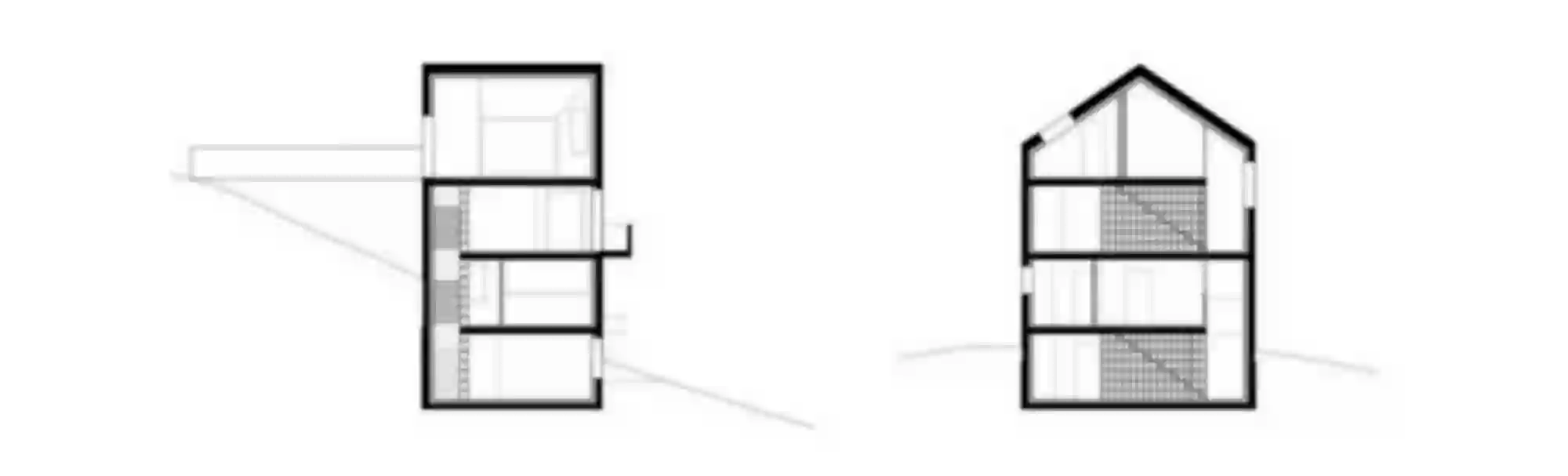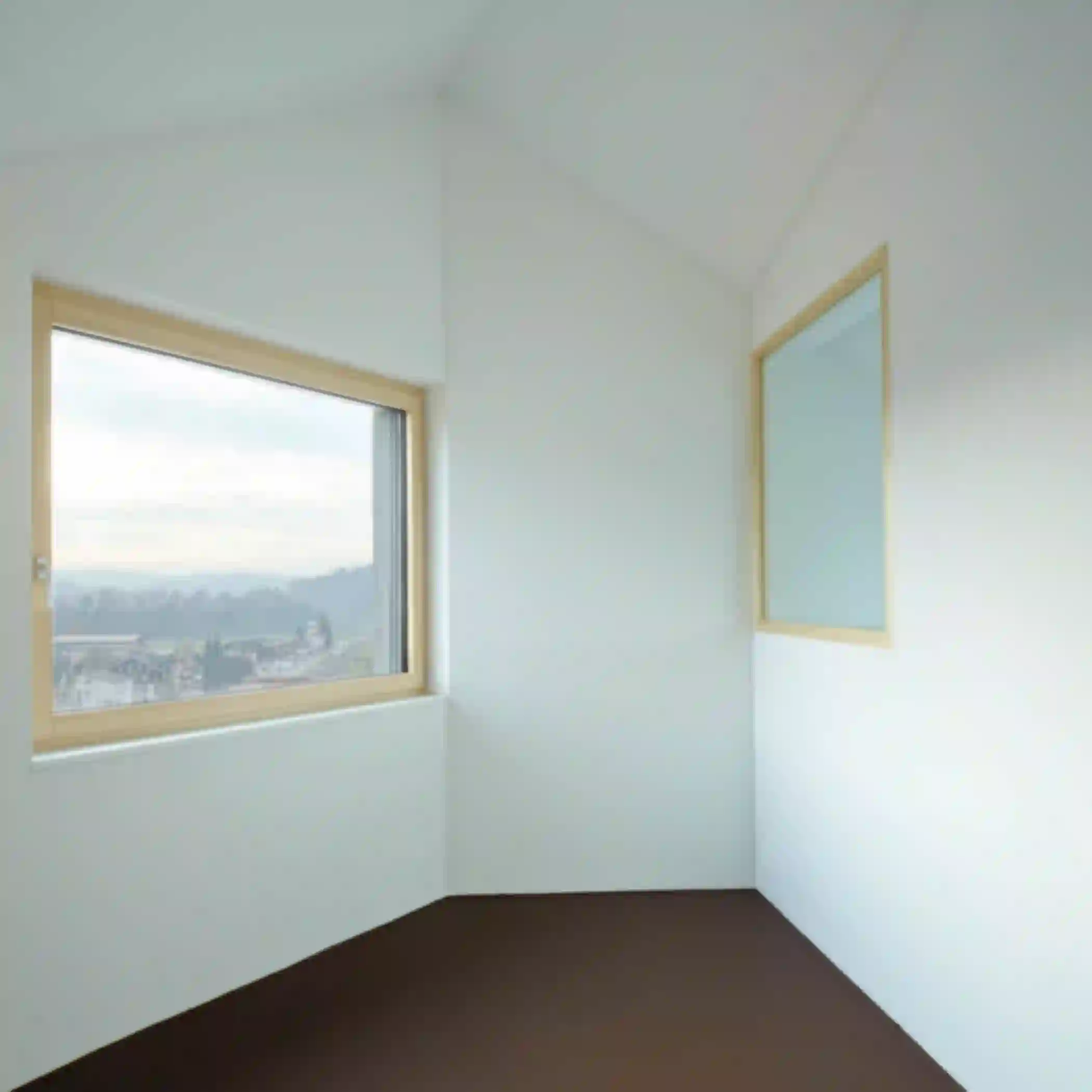Une lecture habile du règlement de construction a permis, sur un terrain d’à peine 70m2, la réalisation d’une maison d’habitation, telle une tour qui jaillit de la colline. Une bibliothèque en bois, imbriquée dans un escalier droit, relie les 4 niveaux d'habitation. La promenade à travers les différents étages offre des vues et perspectives variées sur les alentours. Le bâtiment conçu en béton apparent s’inscrit comme une sculpture dans le paysage environnant et reprend, via son toit en pente, le langage architectural des constructions voisines.