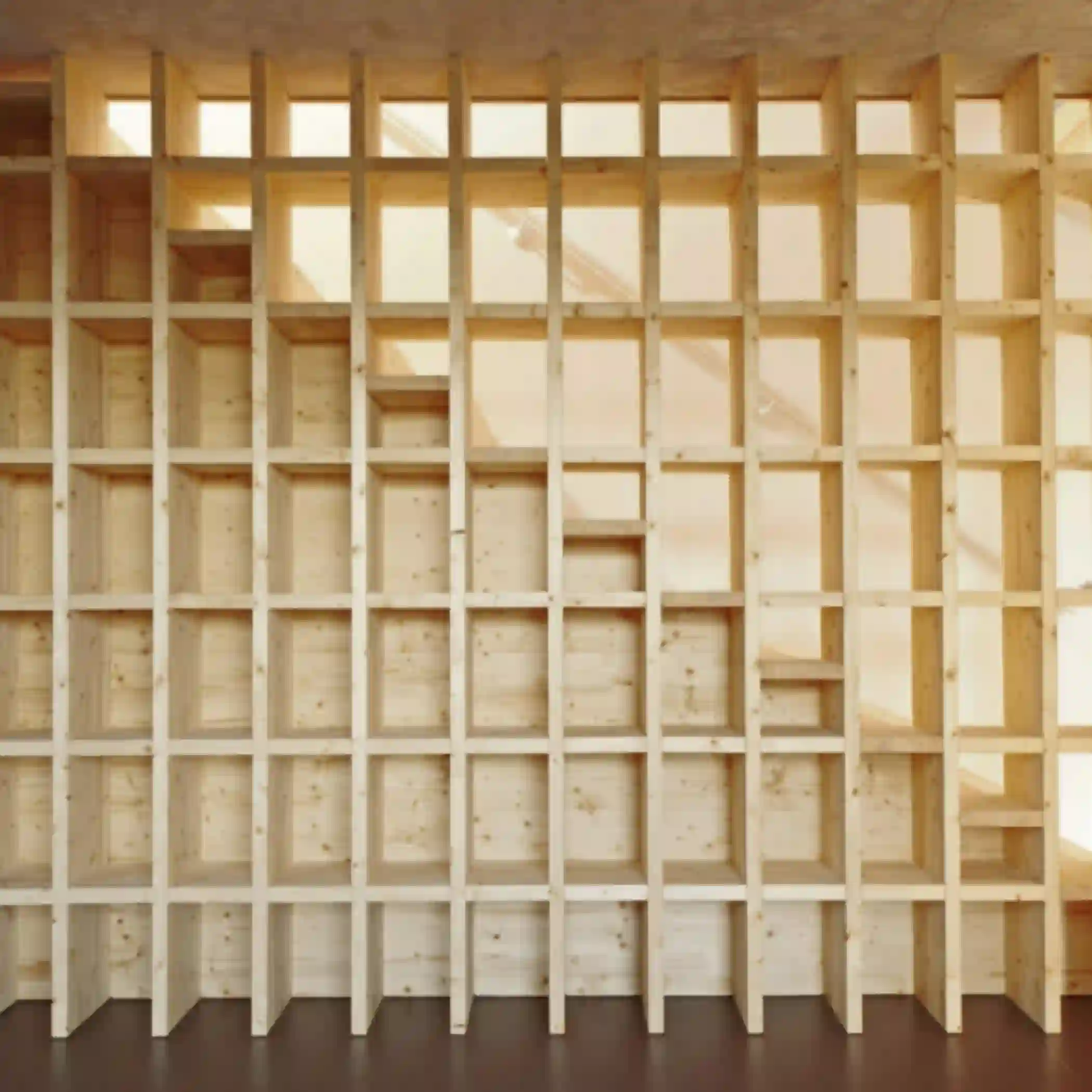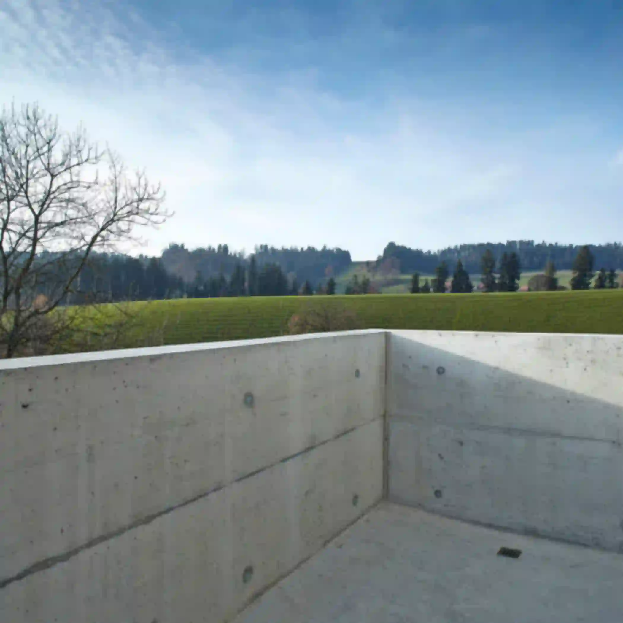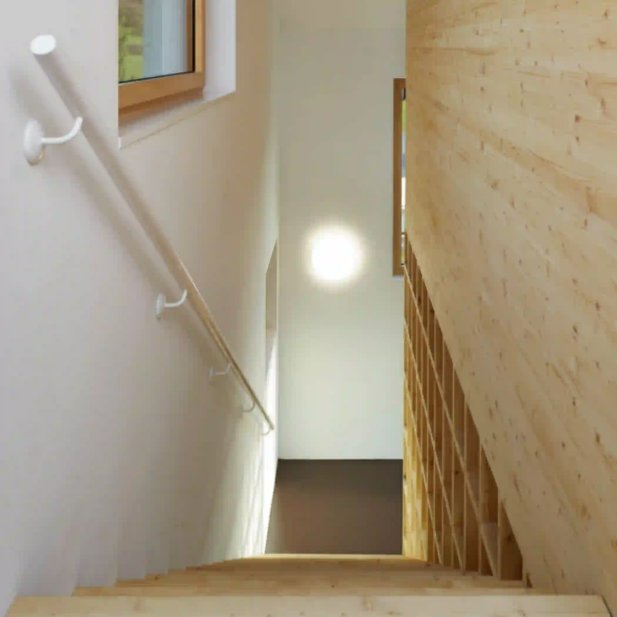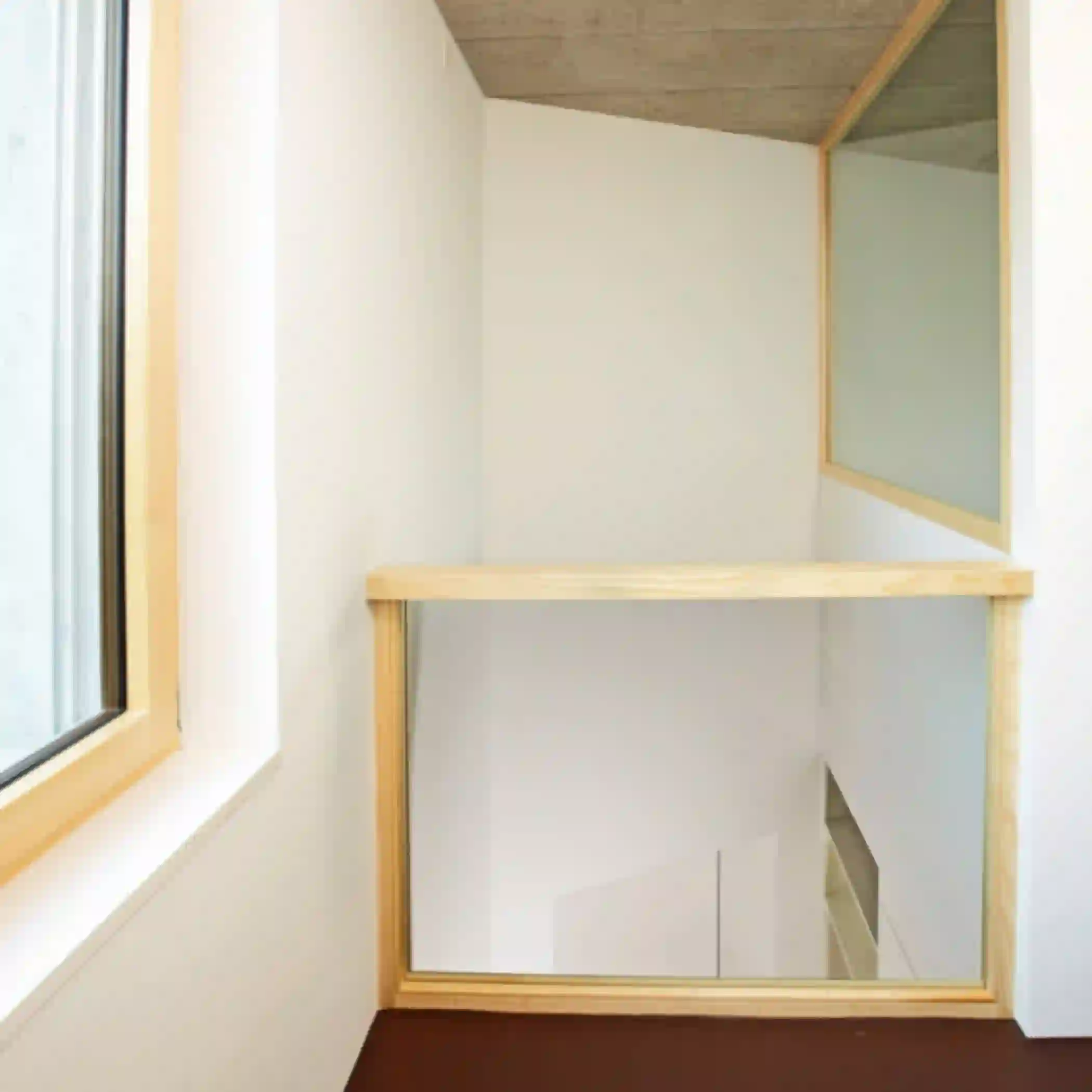 Une lecture habile du règlement de construction a permis, sur un terrain d’à peine 70m2, la réalisation d’une maison d’habitation, telle une tour qui jaillit de la colline. Une bibliothèque en bois, imbriquée dans un escalier droit, relie les 4 niveaux d'habitation. La promenade à travers les différents étages offre des vues et perspectives variées sur les alentours. Le bâtiment conçu en béton apparent s’inscrit comme une sculpture dans le paysage environnant et reprend, via son toit en pente, le langage architectural des constructions voisines.