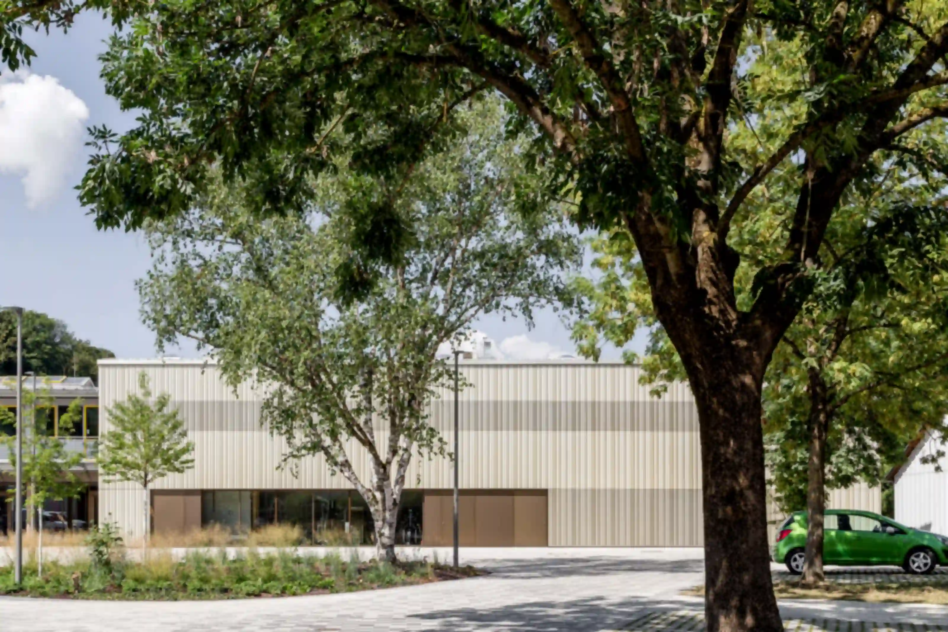 La nouvelle salle de sport double vient remplacer la salle de sport préexistante de l’ensemble scolaire de Niederviehbach. Le projet se glisse sur la parcelle entre les bâtiments découpés de l’école actuelle et ceux de l’école enfantine. Il se présente alors comme un volume indépendant mais étroitement lié au complexe scolaire existant. Le site bénéficie dorénavant d’un foyer commun, dont la fonction est double ; d’une part délimiter un seuil entre quartier et école, avec à l’est l’accès principal et à l’ouest l’accès au préau, et d’autre part relier l'école à la nouvelle salle de sport. La salle de sport en elle-même présente une organisation simple et compacte grâce notamment à la répartition des locaux secondaires sur deux niveaux. Un bardage doré en aluminium habille les façades alors qu’à l’intérieur le béton apparent, du bois clair et des couleurs discrètes dominent.